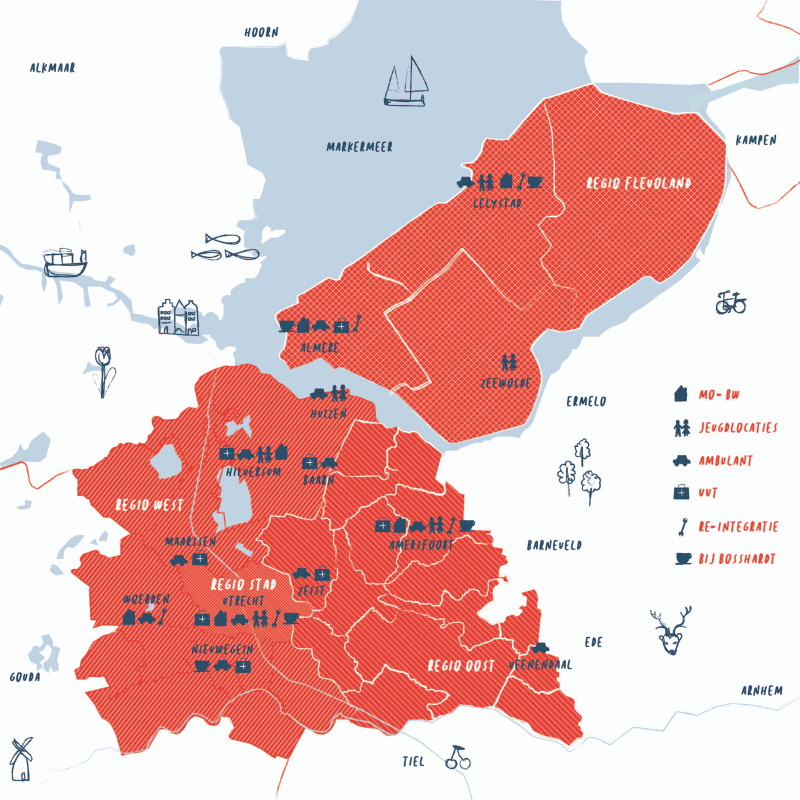 Onder regio West vallen Nieuwegein, Lekstroom, Stichtse Vecht, Woerden en de Gooi & Vechtstreek. In deze regio bieden wij ambulante hulpverlening, maatschappelijke opvang en beschermd wonen, arbeidsre-integratie, jeugdhulp en verpleging & verzorging. Daarnaast zijn er diverse Bij Bosshardt locaties, waar buurtbewoners terecht kunnen voor activiteiten.